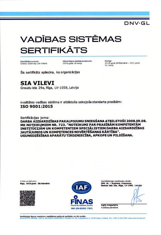 - SIA "Vilevi" ir viens no nedaudzajiem uzņēmjumiem Latvijā, kuru kvalitātes vadības sistēma ir sertificēta atbilstoši ISO 9001 standarta prasībām, un novērtēts, ka ugunsdzēsības aparātu uzpilde un apkope tiek veikta, atbilstoši LVS 402:2014 “Ugunsdzēsības aparātu apkopes punkti. Vispārējās prasības” prasībām.